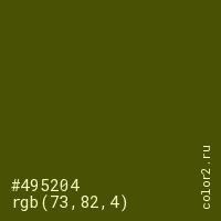 Цвет #495204 в цветовой модели RGB обозначается тремя октетами (73, 82, 4) в десятичном формате и #495204 в шестнадцатиричном (hex) формате, которые являются интенсивностью красного 73 (hex 49), интенсивность зелёного 82 (hex 52) и интенсивность синего 4 (hex 04).