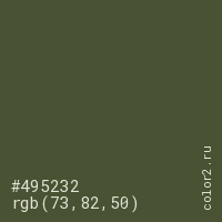 Цвет #495232 в цветовой модели RGB обозначается тремя октетами (73, 82, 50) в десятичном формате и #495232 в шестнадцатиричном (hex) формате, которые являются интенсивностью красного 73 (hex 49), интенсивность зелёного 82 (hex 52) и интенсивность синего 50 (hex 32).