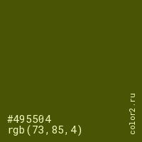 Цвет #495504 в цветовой модели RGB обозначается тремя октетами (73, 85, 4) в десятичном формате и #495504 в шестнадцатиричном (hex) формате, которые являются интенсивностью красного 73 (hex 49), интенсивность зелёного 85 (hex 55) и интенсивность синего 4 (hex 04).