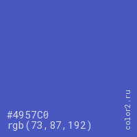 Цвет #4957C0 в цветовой модели RGB обозначается тремя октетами (73, 87, 192) в десятичном формате и #4957C0 в шестнадцатиричном (hex) формате, которые являются интенсивностью красного 73 (hex 49), интенсивность зелёного 87 (hex 57) и интенсивность синего 192 (hex C0).
