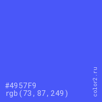 Цвет #4957F9 в цветовой модели RGB обозначается тремя октетами (73, 87, 249) в десятичном формате и #4957F9 в шестнадцатиричном (hex) формате, которые являются интенсивностью красного 73 (hex 49), интенсивность зелёного 87 (hex 57) и интенсивность синего 249 (hex F9).