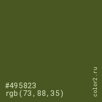 Цвет #495823 в цветовой модели RGB обозначается тремя октетами (73, 88, 35) в десятичном формате и #495823 в шестнадцатиричном (hex) формате, которые являются интенсивностью красного 73 (hex 49), интенсивность зелёного 88 (hex 58) и интенсивность синего 35 (hex 23).