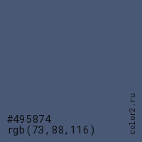 Цвет #495874 в цветовой модели RGB обозначается тремя октетами (73, 88, 116) в десятичном формате и #495874 в шестнадцатиричном (hex) формате, которые являются интенсивностью красного 73 (hex 49), интенсивность зелёного 88 (hex 58) и интенсивность синего 116 (hex 74).