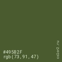 Цвет #495B2F в цветовой модели RGB обозначается тремя октетами (73, 91, 47) в десятичном формате и #495B2F в шестнадцатиричном (hex) формате, которые являются интенсивностью красного 73 (hex 49), интенсивность зелёного 91 (hex 5B) и интенсивность синего 47 (hex 2F).