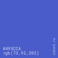 Цвет #495CCA в цветовой модели RGB обозначается тремя октетами (73, 92, 202) в десятичном формате и #495CCA в шестнадцатиричном (hex) формате, которые являются интенсивностью красного 73 (hex 49), интенсивность зелёного 92 (hex 5C) и интенсивность синего 202 (hex CA).