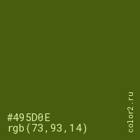 Цвет #495D0E в цветовой модели RGB обозначается тремя октетами (73, 93, 14) в десятичном формате и #495D0E в шестнадцатиричном (hex) формате, которые являются интенсивностью красного 73 (hex 49), интенсивность зелёного 93 (hex 5D) и интенсивность синего 14 (hex 0E).