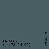 Цвет #495E62 в цветовой модели RGB обозначается тремя октетами (73, 94, 98) в десятичном формате и #495E62 в шестнадцатиричном (hex) формате, которые являются интенсивностью красного 73 (hex 49), интенсивность зелёного 94 (hex 5E) и интенсивность синего 98 (hex 62).