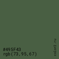 Цвет #495F43 в цветовой модели RGB обозначается тремя октетами (73, 95, 67) в десятичном формате и #495F43 в шестнадцатиричном (hex) формате, которые являются интенсивностью красного 73 (hex 49), интенсивность зелёного 95 (hex 5F) и интенсивность синего 67 (hex 43).