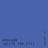 Цвет #4964AB в цветовой модели RGB обозначается тремя октетами (73, 100, 171) в десятичном формате и #4964AB в шестнадцатиричном (hex) формате, которые являются интенсивностью красного 73 (hex 49), интенсивность зелёного 100 (hex 64) и интенсивность синего 171 (hex AB).