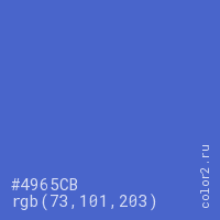 Цвет #4965CB в цветовой модели RGB обозначается тремя октетами (73, 101, 203) в десятичном формате и #4965CB в шестнадцатиричном (hex) формате, которые являются интенсивностью красного 73 (hex 49), интенсивность зелёного 101 (hex 65) и интенсивность синего 203 (hex CB).