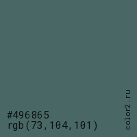 Цвет #496865 в цветовой модели RGB обозначается тремя октетами (73, 104, 101) в десятичном формате и #496865 в шестнадцатиричном (hex) формате, которые являются интенсивностью красного 73 (hex 49), интенсивность зелёного 104 (hex 68) и интенсивность синего 101 (hex 65).