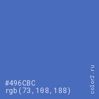 Цвет #496CBC в цветовой модели RGB обозначается тремя октетами (73, 108, 188) в десятичном формате и #496CBC в шестнадцатиричном (hex) формате, которые являются интенсивностью красного 73 (hex 49), интенсивность зелёного 108 (hex 6C) и интенсивность синего 188 (hex BC).