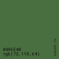 Цвет #496E40 в цветовой модели RGB обозначается тремя октетами (73, 110, 64) в десятичном формате и #496E40 в шестнадцатиричном (hex) формате, которые являются интенсивностью красного 73 (hex 49), интенсивность зелёного 110 (hex 6E) и интенсивность синего 64 (hex 40).