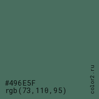 Цвет #496E5F в цветовой модели RGB обозначается тремя октетами (73, 110, 95) в десятичном формате и #496E5F в шестнадцатиричном (hex) формате, которые являются интенсивностью красного 73 (hex 49), интенсивность зелёного 110 (hex 6E) и интенсивность синего 95 (hex 5F).