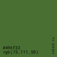 Цвет #496F32 в цветовой модели RGB обозначается тремя октетами (73, 111, 50) в десятичном формате и #496F32 в шестнадцатиричном (hex) формате, которые являются интенсивностью красного 73 (hex 49), интенсивность зелёного 111 (hex 6F) и интенсивность синего 50 (hex 32).