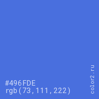 Цвет #496FDE в цветовой модели RGB обозначается тремя октетами (73, 111, 222) в десятичном формате и #496FDE в шестнадцатиричном (hex) формате, которые являются интенсивностью красного 73 (hex 49), интенсивность зелёного 111 (hex 6F) и интенсивность синего 222 (hex DE).