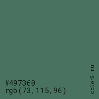 Цвет #497360 в цветовой модели RGB обозначается тремя октетами (73, 115, 96) в десятичном формате и #497360 в шестнадцатиричном (hex) формате, которые являются интенсивностью красного 73 (hex 49), интенсивность зелёного 115 (hex 73) и интенсивность синего 96 (hex 60).