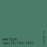 Цвет #497C69 в цветовой модели RGB обозначается тремя октетами (73, 124, 105) в десятичном формате и #497C69 в шестнадцатиричном (hex) формате, которые являются интенсивностью красного 73 (hex 49), интенсивность зелёного 124 (hex 7C) и интенсивность синего 105 (hex 69).