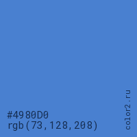 Цвет #4980D0 в цветовой модели RGB обозначается тремя октетами (73, 128, 208) в десятичном формате и #4980D0 в шестнадцатиричном (hex) формате, которые являются интенсивностью красного 73 (hex 49), интенсивность зелёного 128 (hex 80) и интенсивность синего 208 (hex D0).