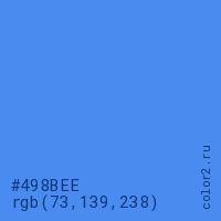 Цвет #498BEE в цветовой модели RGB обозначается тремя октетами (73, 139, 238) в десятичном формате и #498BEE в шестнадцатиричном (hex) формате, которые являются интенсивностью красного 73 (hex 49), интенсивность зелёного 139 (hex 8B) и интенсивность синего 238 (hex EE).