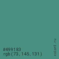 Цвет #499183 в цветовой модели RGB обозначается тремя октетами (73, 145, 131) в десятичном формате и #499183 в шестнадцатиричном (hex) формате, которые являются интенсивностью красного 73 (hex 49), интенсивность зелёного 145 (hex 91) и интенсивность синего 131 (hex 83).