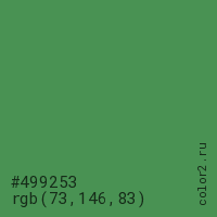 Цвет #499253 в цветовой модели RGB обозначается тремя октетами (73, 146, 83) в десятичном формате и #499253 в шестнадцатиричном (hex) формате, которые являются интенсивностью красного 73 (hex 49), интенсивность зелёного 146 (hex 92) и интенсивность синего 83 (hex 53).