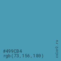 Цвет #499CB4 в цветовой модели RGB обозначается тремя октетами (73, 156, 180) в десятичном формате и #499CB4 в шестнадцатиричном (hex) формате, которые являются интенсивностью красного 73 (hex 49), интенсивность зелёного 156 (hex 9C) и интенсивность синего 180 (hex B4).
