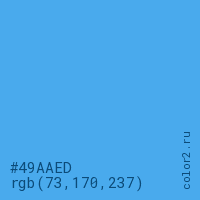 Цвет #49AAED в цветовой модели RGB обозначается тремя октетами (73, 170, 237) в десятичном формате и #49AAED в шестнадцатиричном (hex) формате, которые являются интенсивностью красного 73 (hex 49), интенсивность зелёного 170 (hex AA) и интенсивность синего 237 (hex ED).
