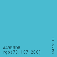 Цвет #49BBD0 в цветовой модели RGB обозначается тремя октетами (73, 187, 208) в десятичном формате и #49BBD0 в шестнадцатиричном (hex) формате, которые являются интенсивностью красного 73 (hex 49), интенсивность зелёного 187 (hex BB) и интенсивность синего 208 (hex D0).