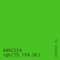 Цвет #49C224 в цветовой модели RGB обозначается тремя октетами (73, 194, 36) в десятичном формате и #49C224 в шестнадцатиричном (hex) формате, которые являются интенсивностью красного 73 (hex 49), интенсивность зелёного 194 (hex C2) и интенсивность синего 36 (hex 24).