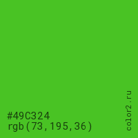 Цвет #49C324 в цветовой модели RGB обозначается тремя октетами (73, 195, 36) в десятичном формате и #49C324 в шестнадцатиричном (hex) формате, которые являются интенсивностью красного 73 (hex 49), интенсивность зелёного 195 (hex C3) и интенсивность синего 36 (hex 24).