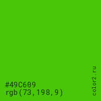 Цвет #49C609 в цветовой модели RGB обозначается тремя октетами (73, 198, 9) в десятичном формате и #49C609 в шестнадцатиричном (hex) формате, которые являются интенсивностью красного 73 (hex 49), интенсивность зелёного 198 (hex C6) и интенсивность синего 9 (hex 09).