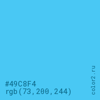 Цвет #49C8F4 в цветовой модели RGB обозначается тремя октетами (73, 200, 244) в десятичном формате и #49C8F4 в шестнадцатиричном (hex) формате, которые являются интенсивностью красного 73 (hex 49), интенсивность зелёного 200 (hex C8) и интенсивность синего 244 (hex F4).
