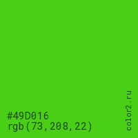 Цвет #49D016 в цветовой модели RGB обозначается тремя октетами (73, 208, 22) в десятичном формате и #49D016 в шестнадцатиричном (hex) формате, которые являются интенсивностью красного 73 (hex 49), интенсивность зелёного 208 (hex D0) и интенсивность синего 22 (hex 16).