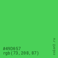 Цвет #49D057 в цветовой модели RGB обозначается тремя октетами (73, 208, 87) в десятичном формате и #49D057 в шестнадцатиричном (hex) формате, которые являются интенсивностью красного 73 (hex 49), интенсивность зелёного 208 (hex D0) и интенсивность синего 87 (hex 57).