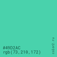 Цвет #49D2AC в цветовой модели RGB обозначается тремя октетами (73, 210, 172) в десятичном формате и #49D2AC в шестнадцатиричном (hex) формате, которые являются интенсивностью красного 73 (hex 49), интенсивность зелёного 210 (hex D2) и интенсивность синего 172 (hex AC).