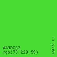 Цвет #49DC32 в цветовой модели RGB обозначается тремя октетами (73, 220, 50) в десятичном формате и #49DC32 в шестнадцатиричном (hex) формате, которые являются интенсивностью красного 73 (hex 49), интенсивность зелёного 220 (hex DC) и интенсивность синего 50 (hex 32).