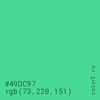Цвет #49DC97 в цветовой модели RGB обозначается тремя октетами (73, 220, 151) в десятичном формате и #49DC97 в шестнадцатиричном (hex) формате, которые являются интенсивностью красного 73 (hex 49), интенсивность зелёного 220 (hex DC) и интенсивность синего 151 (hex 97).