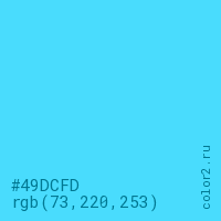Цвет #49DCFD в цветовой модели RGB обозначается тремя октетами (73, 220, 253) в десятичном формате и #49DCFD в шестнадцатиричном (hex) формате, которые являются интенсивностью красного 73 (hex 49), интенсивность зелёного 220 (hex DC) и интенсивность синего 253 (hex FD).