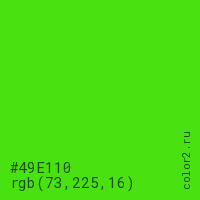 Цвет #49E110 в цветовой модели RGB обозначается тремя октетами (73, 225, 16) в десятичном формате и #49E110 в шестнадцатиричном (hex) формате, которые являются интенсивностью красного 73 (hex 49), интенсивность зелёного 225 (hex E1) и интенсивность синего 16 (hex 10).