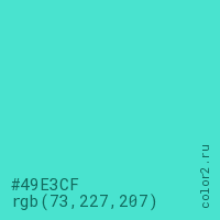 Цвет #49E3CF в цветовой модели RGB обозначается тремя октетами (73, 227, 207) в десятичном формате и #49E3CF в шестнадцатиричном (hex) формате, которые являются интенсивностью красного 73 (hex 49), интенсивность зелёного 227 (hex E3) и интенсивность синего 207 (hex CF).
