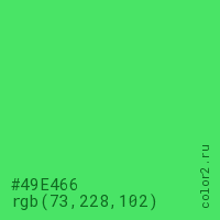 Цвет #49E466 в цветовой модели RGB обозначается тремя октетами (73, 228, 102) в десятичном формате и #49E466 в шестнадцатиричном (hex) формате, которые являются интенсивностью красного 73 (hex 49), интенсивность зелёного 228 (hex E4) и интенсивность синего 102 (hex 66).