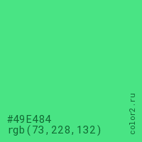 Цвет #49E484 в цветовой модели RGB обозначается тремя октетами (73, 228, 132) в десятичном формате и #49E484 в шестнадцатиричном (hex) формате, которые являются интенсивностью красного 73 (hex 49), интенсивность зелёного 228 (hex E4) и интенсивность синего 132 (hex 84).