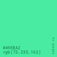 Цвет #49EBA2 в цветовой модели RGB обозначается тремя октетами (73, 235, 162) в десятичном формате и #49EBA2 в шестнадцатиричном (hex) формате, которые являются интенсивностью красного 73 (hex 49), интенсивность зелёного 235 (hex EB) и интенсивность синего 162 (hex A2).