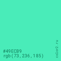 Цвет #49ECB9 в цветовой модели RGB обозначается тремя октетами (73, 236, 185) в десятичном формате и #49ECB9 в шестнадцатиричном (hex) формате, которые являются интенсивностью красного 73 (hex 49), интенсивность зелёного 236 (hex EC) и интенсивность синего 185 (hex B9).