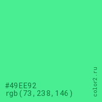 Цвет #49EE92 в цветовой модели RGB обозначается тремя октетами (73, 238, 146) в десятичном формате и #49EE92 в шестнадцатиричном (hex) формате, которые являются интенсивностью красного 73 (hex 49), интенсивность зелёного 238 (hex EE) и интенсивность синего 146 (hex 92).