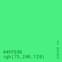 Цвет #49F080 в цветовой модели RGB обозначается тремя октетами (73, 240, 128) в десятичном формате и #49F080 в шестнадцатиричном (hex) формате, которые являются интенсивностью красного 73 (hex 49), интенсивность зелёного 240 (hex F0) и интенсивность синего 128 (hex 80).