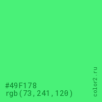 Цвет #49F178 в цветовой модели RGB обозначается тремя октетами (73, 241, 120) в десятичном формате и #49F178 в шестнадцатиричном (hex) формате, которые являются интенсивностью красного 73 (hex 49), интенсивность зелёного 241 (hex F1) и интенсивность синего 120 (hex 78).