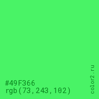 Цвет #49F366 в цветовой модели RGB обозначается тремя октетами (73, 243, 102) в десятичном формате и #49F366 в шестнадцатиричном (hex) формате, которые являются интенсивностью красного 73 (hex 49), интенсивность зелёного 243 (hex F3) и интенсивность синего 102 (hex 66).