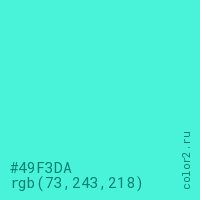 Цвет #49F3DA в цветовой модели RGB обозначается тремя октетами (73, 243, 218) в десятичном формате и #49F3DA в шестнадцатиричном (hex) формате, которые являются интенсивностью красного 73 (hex 49), интенсивность зелёного 243 (hex F3) и интенсивность синего 218 (hex DA).